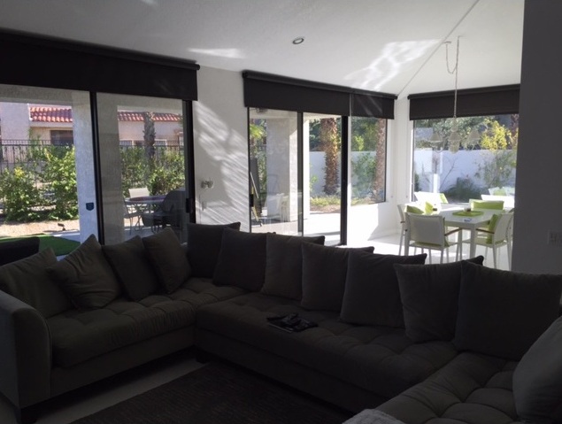 beautiful ebony roller shades to the ceiling on black aluminum framed sliding glass doors.