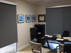 The pic on left had old mini-blinds. The pic on right shows new privacy roller shades in a blue slate color with anodized aluminum fascias.. It really transformed this office.